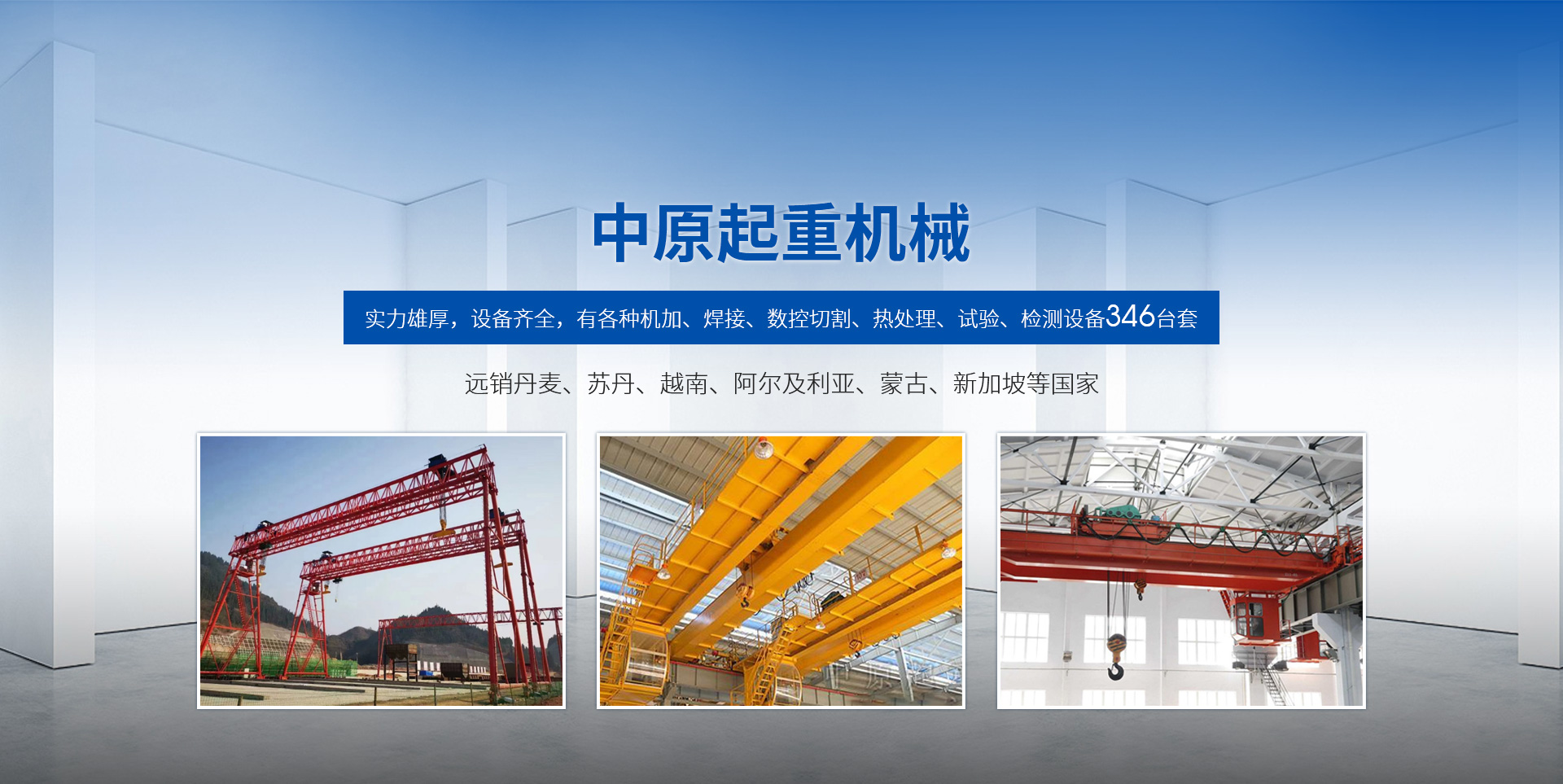 新鄉市中原起重機械有限公司成立于2000年,地處中原,輻射全國28個省市自治區,設外埠經銷處、辦事處268個。產品行銷工礦、建材、化工、冶金、電力、交通、鐵路、油田、港口等各個行業。遠銷丹麥、蘇丹、越南、阿爾及利亞、蒙古、新加坡等國家?! 」緦嵙π酆瘢O備齊全,有各種機加、焊接、數控切割、熱處理、試驗、檢測設備7臺;有機加工、熱處理、單、雙梁橋門機生產、檢測、安裝等9個車間,研究中心、運輸公司、安裝維修服務公司等機構,?  主要產品有:LD型1~20噸電動單梁起重機系列產品;5~600噸通用橋式、門式、冶金、上旋轉下旋轉電磁吊、絕緣、抓斗、防爆起重機系列產品;LH3~100噸葫蘆雙梁系列產品;MH5~32噸葫蘆門式系列產品;0.5~40噸CD1、MD1鋼絲繩電葫蘆系列產品;HS1型0.5~20噸手動葫蘆系列產品;0.5~10噸環鏈電動葫蘆系列;0.5~40噸彎道電動葫蘆系列產品;裝卸橋、造船門機、架橋機、鑄造吊和水電大噸位起重機系列產品。  公司建立了強有力的質量保證體系和生產過程的質量控制系統,嚴格執行國家設計、生產標準,有嚴格的生產工藝過程和標準,嚴格的檢驗、檢測標準和手段。
